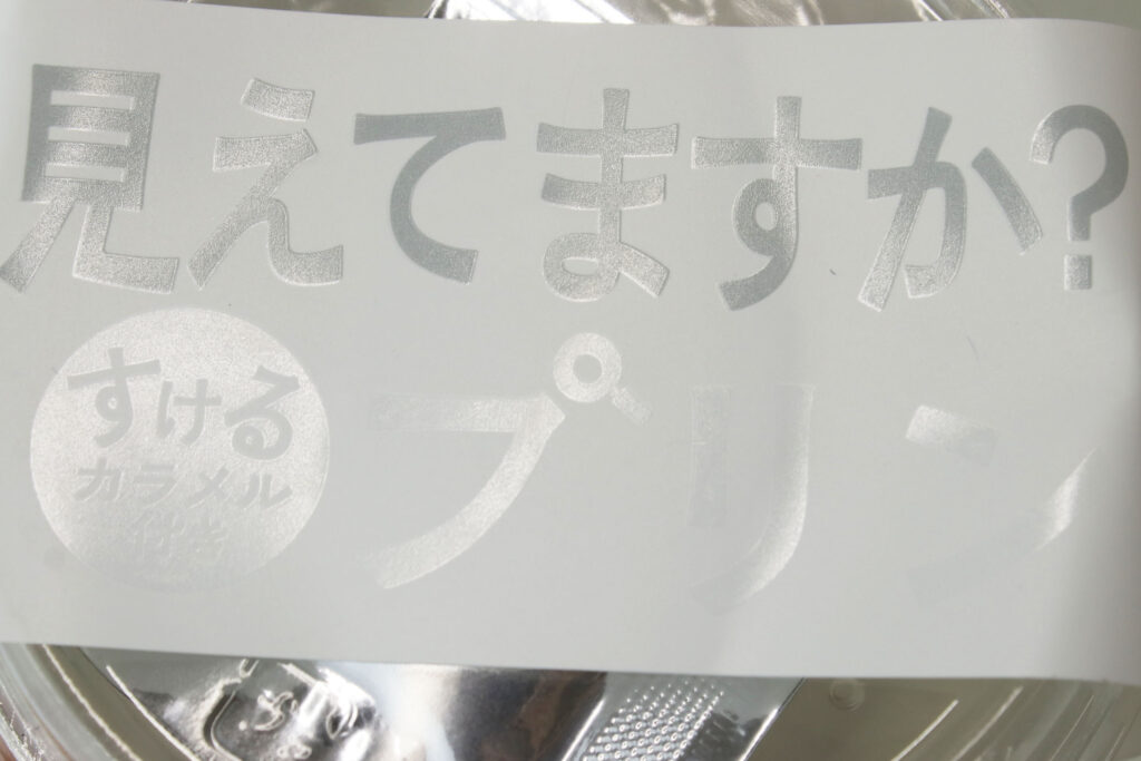 手にとって角度を変えて見てみると「すけるカラメル付き プリン」という文字が見えてきます!