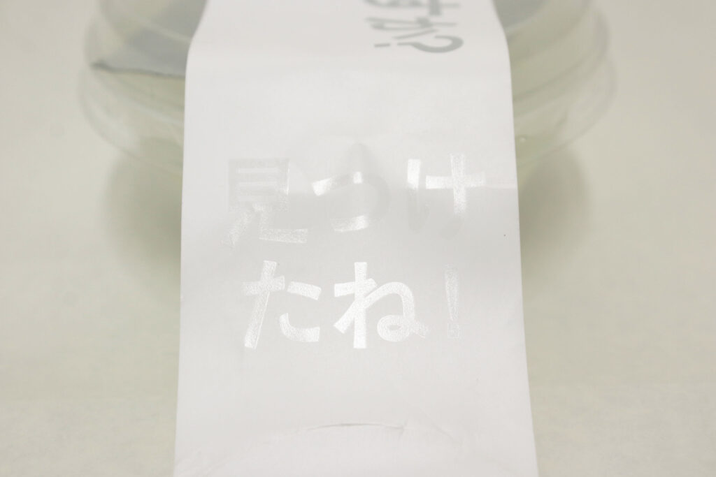 右側面、ぱっと見はなんのデザインもされていないように見えますが、こちらも角度を変えるとなんと文字が浮かび上がってきます!!「見つけたね!」と記載がありました。最後まで楽しい仕掛けがあってとても面白いです!