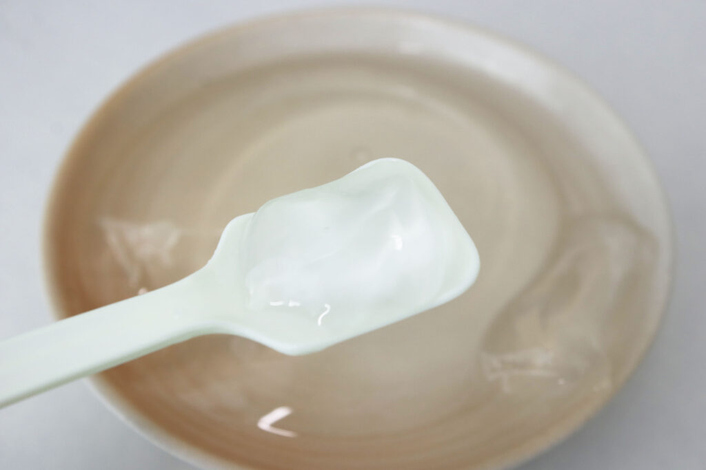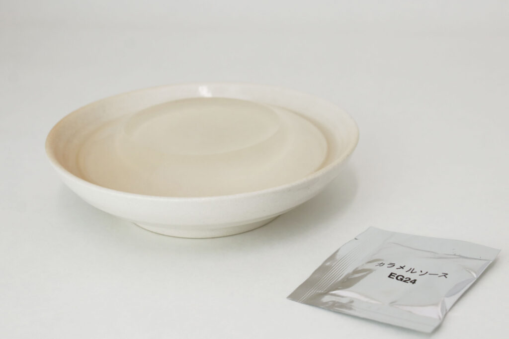 カップに入っている状態の時よりもさらに透けて見えます。カラメルソースをかけてみると、表面に記載のある通り、本当に透明で透けています!😳