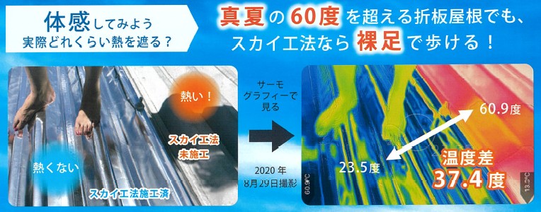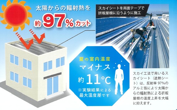 屋根にスカイシート(アルミ製純度99%の遮熱シート)を施工するだけで室内温度最大-11℃!