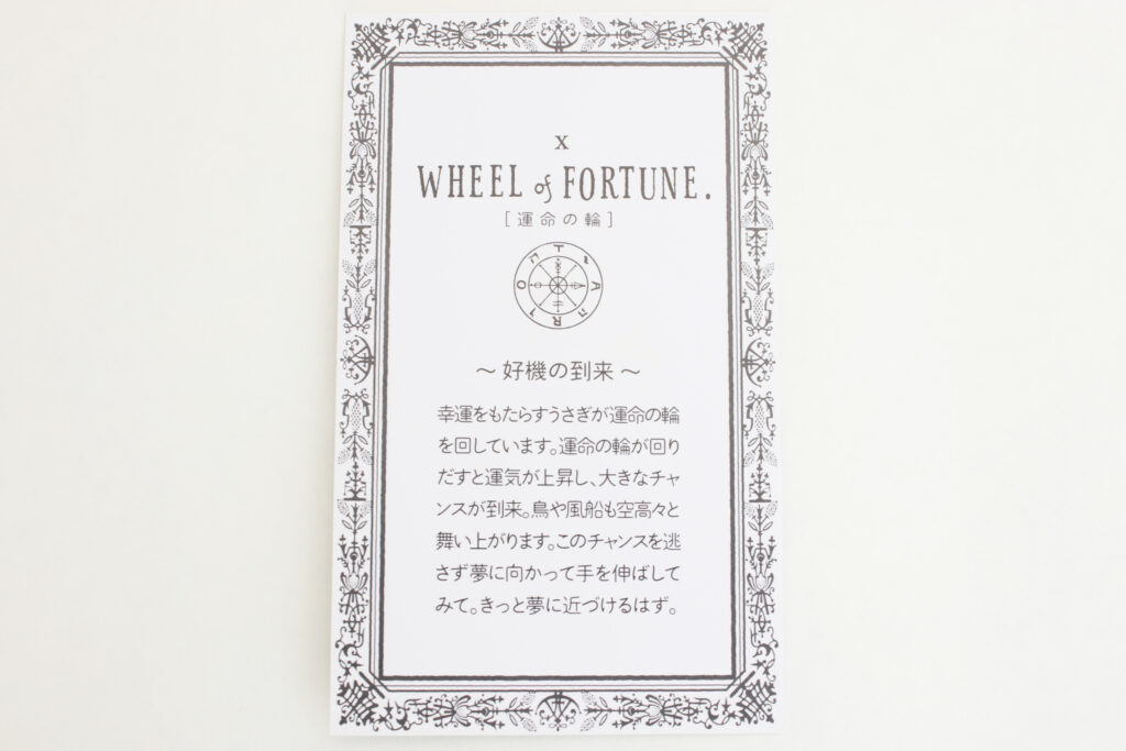 この商品のカードは、意味は同じですが、「幸運をもたらすうさぎ」のワードがあったり、鳥や風船が舞い上がる様子をチャンスが到来という意味にかけています。