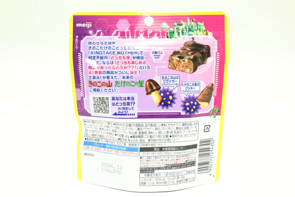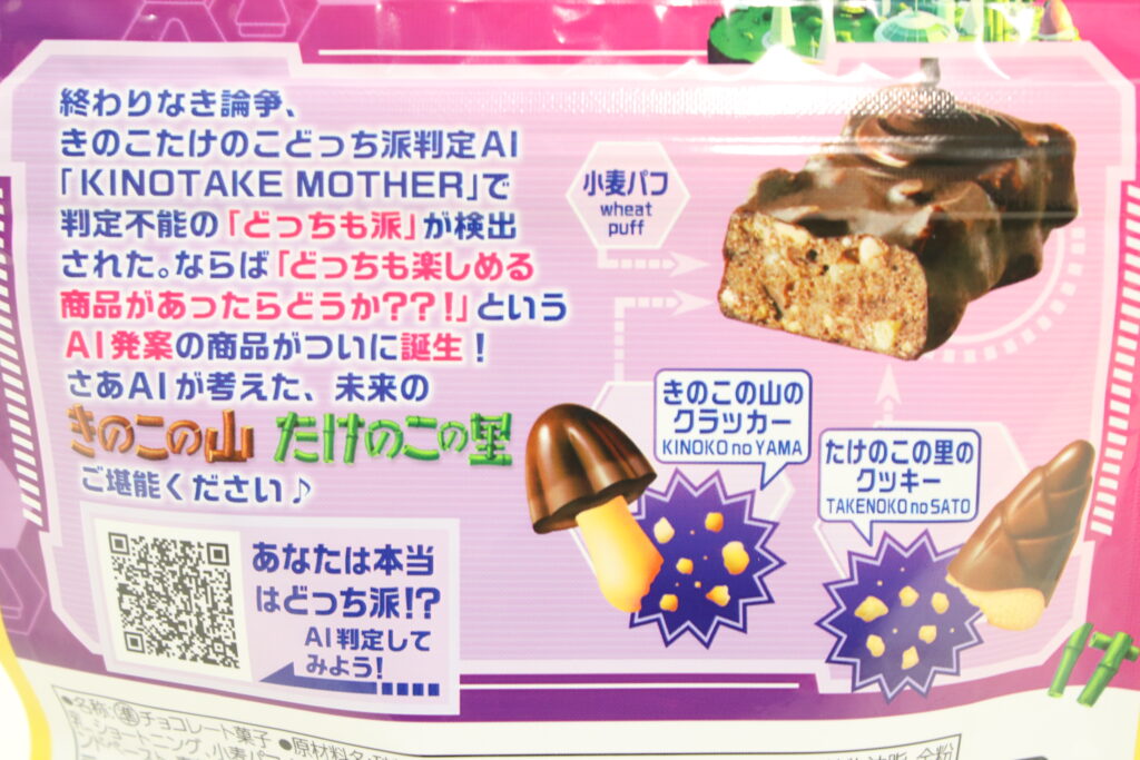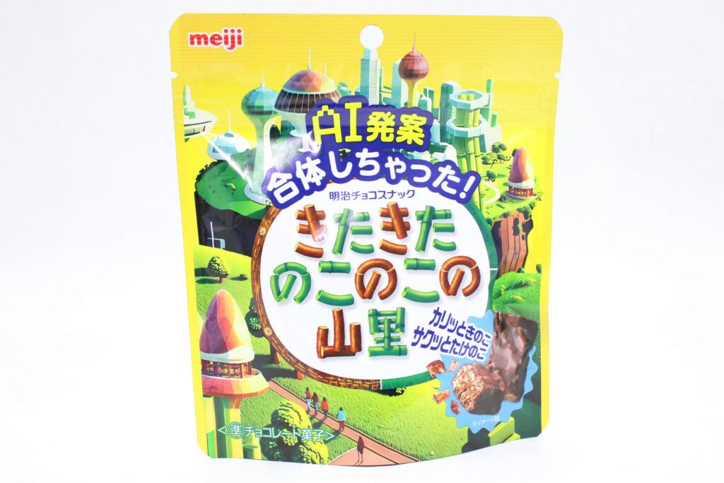 パッケージは、AIが考案した“未来のきのこの山とたけのこの里の世界”をデザインしたそうです。近未来のきのこ・たけのこタウンは立体的な絵のタッチもあってか、AIが考えた未来感がよく出ています。底にはきのこの山とたけのこの里のロゴとイラストが入っています。共存している…!?!?